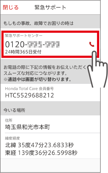 ワンタッチで「緊急サポートセンター」へ電話連絡ができます。